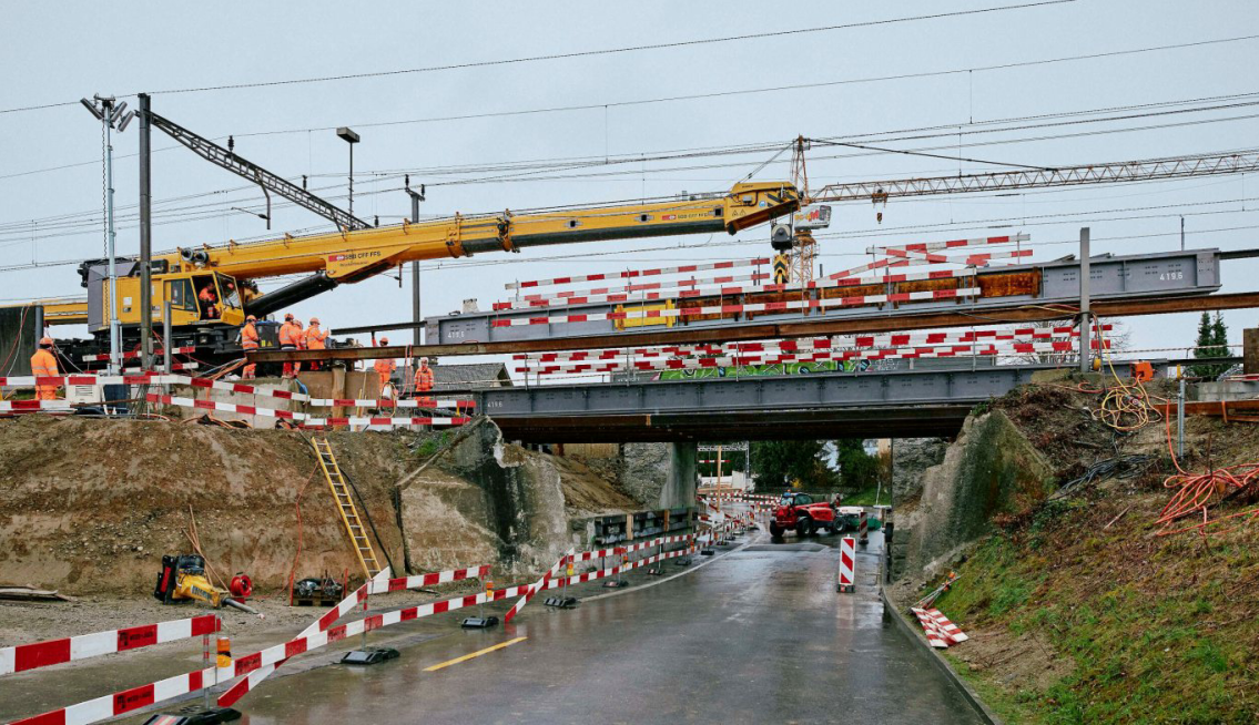 Am 14.03.2026 wurden bei der Unterführung Zürcherstrasse in Muri die Hilfsbrücken erfolgreich eingebaut. Damit ist eine zentrale Voraussetzung geschaffen, um die Bauarbeiten unter laufendem Bahn- und Strassenverkehr weiterzuführen.