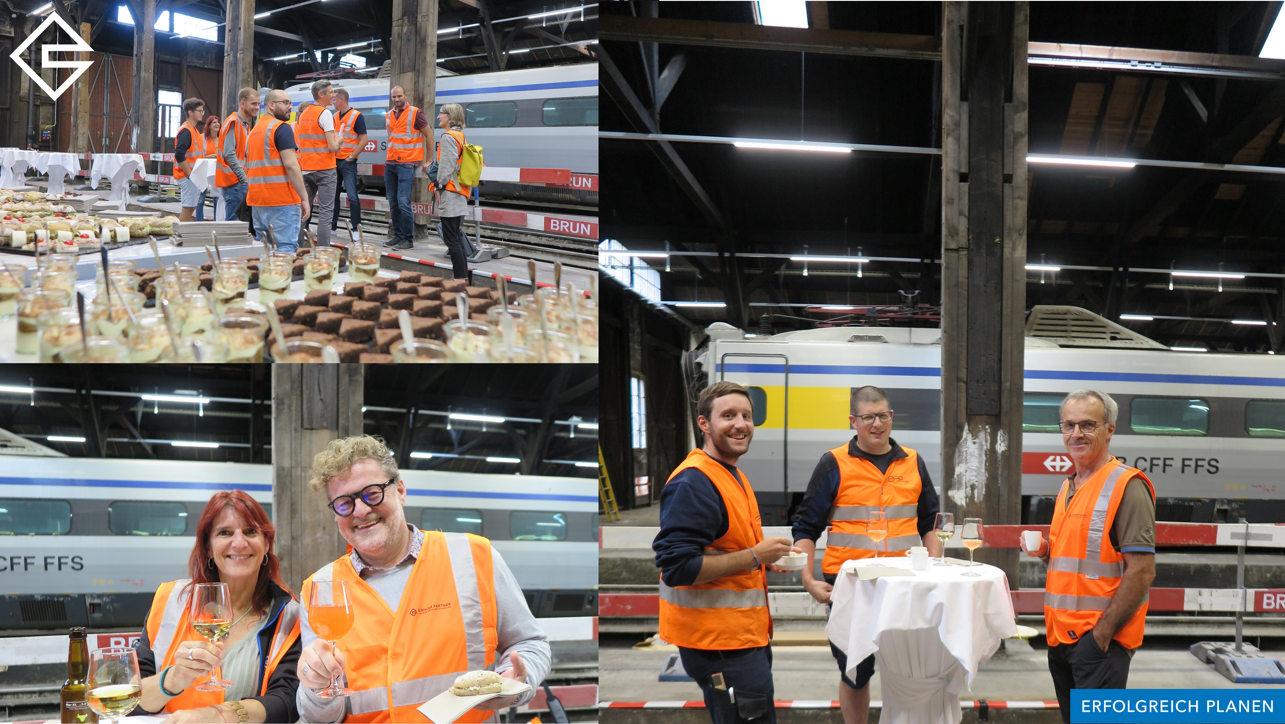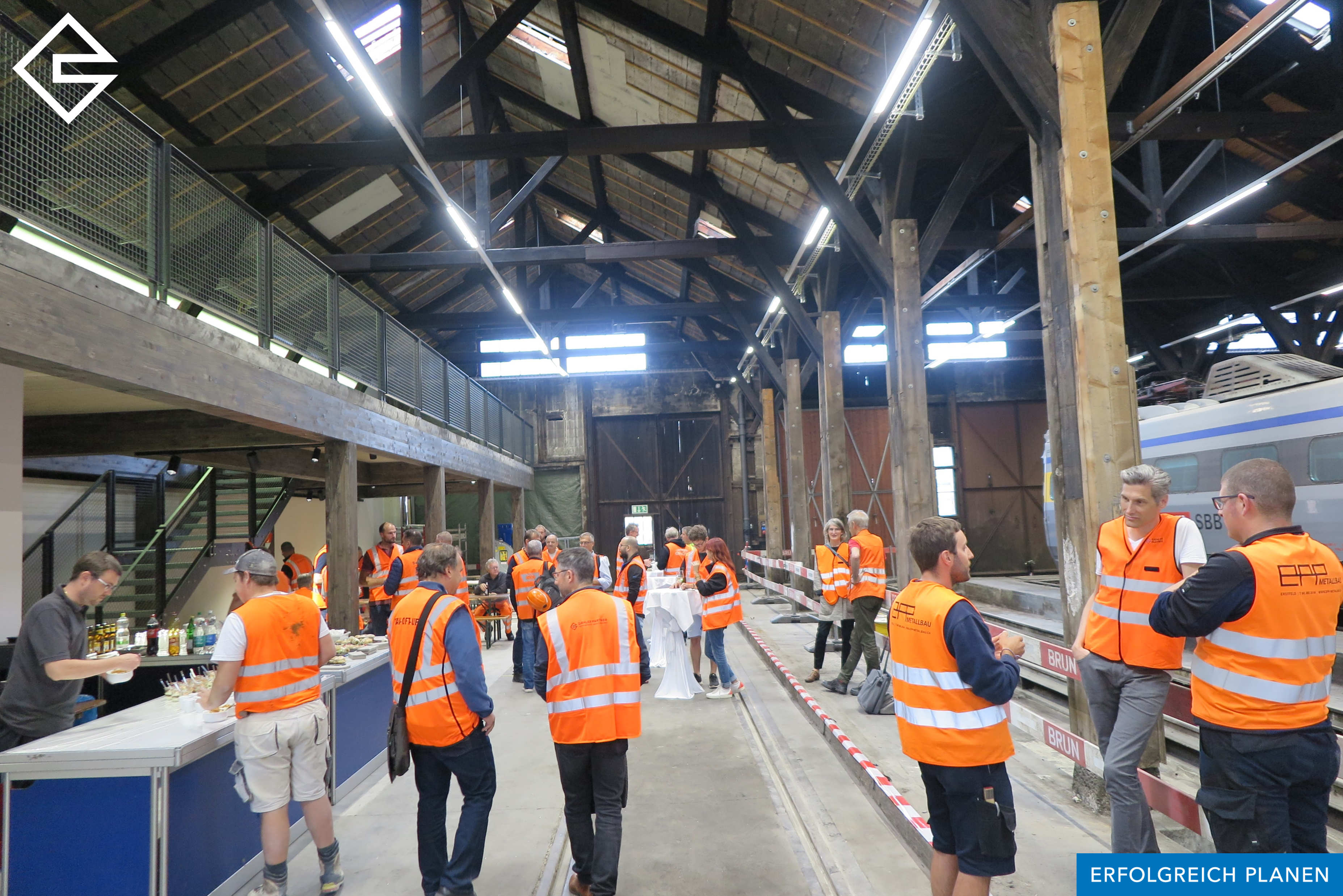 Zusammen mit dem Generalplaner Gähler und Partner AG, dem Verein SBB Historic (die zukünftigen Nutzer der Remisen), den Vertretern des SBB Denkmalschutzes und den engagierten Bauunternehmen vor Ort versammelten wir uns zu diesem freudigen Anlass.