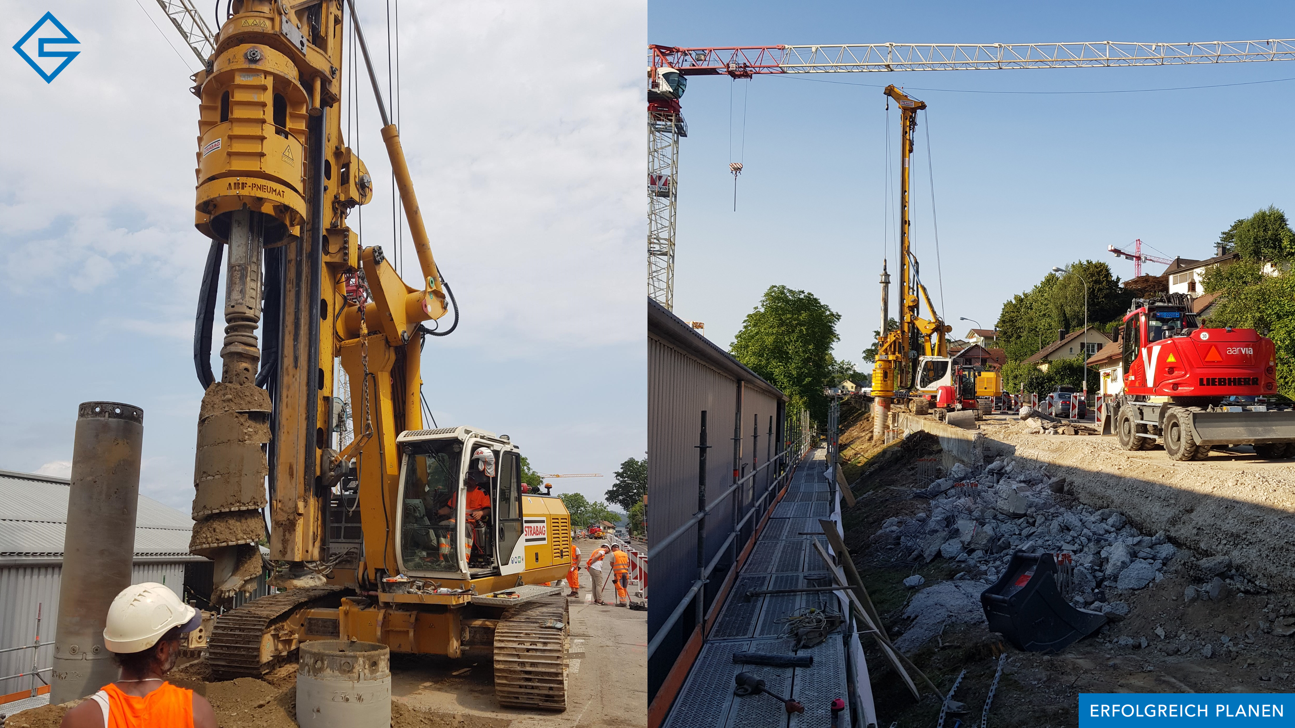 Aufgrund der vorhandenen Hangneigung ist die Realisierung einer Stützkonstruktion notwendig. Mit dem Beginn der Sommerferien 2023 starteten die Bohrarbeiten für die Erstellung der Pfähle. Die beengten Platzverhältnisse, die bestehenden Werkleitungen und das straffe Terminprogramm bilden die Herausforderungen bei der Ausführung.