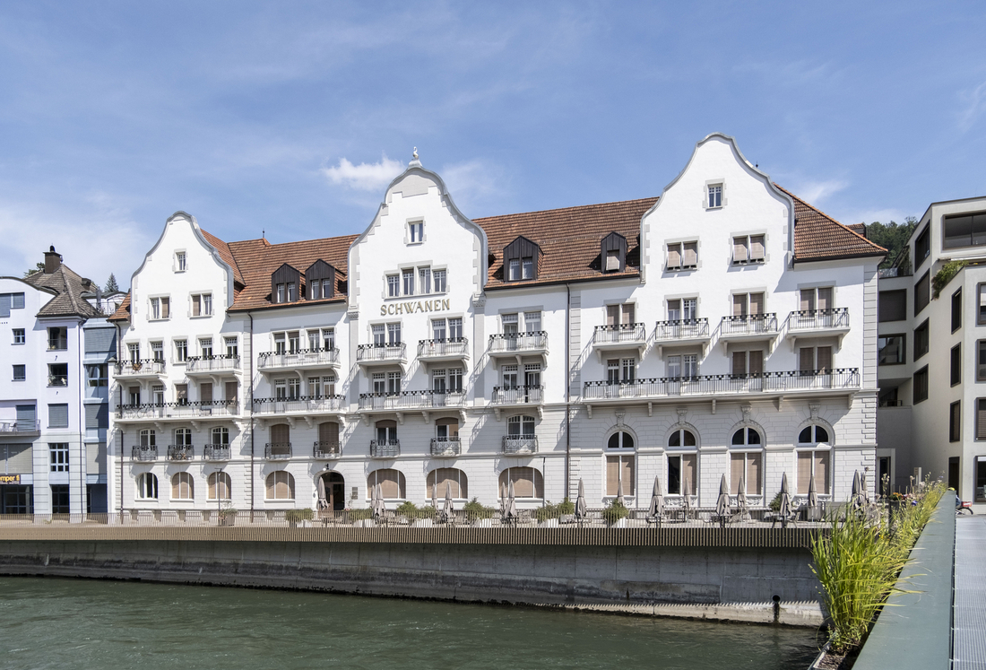 Das ehemalige Jugendstilhotel Schwanen wurde nach Jahren der Fremdnutzung wieder seiner ursprünglichen Bestimmung, der eines öffentlich zugänglichen Hauses, zugeführt. Die Nutzung des sanierten und umgebautem Schwanens umfasst die Bereiche Gastronomie, Gesundheit, Business Apartments und Wohnungen. Die bauzeitliche Substanz wurde aufwendig restauriert, partiell rekonstruiert und in ihren Ursprungszustand von 1910 zurückgeführt. In den oberen Geschossen wurde die Mantellinie des Hauses beibehalten, einzig der Treppenhauskern sowie die transparent ausgeführte Erschliessungszone zu den Zimmern/ Apartment zeigen sich in neuer Gestalt. Die Grundrisse wurden neu organisiert und in die vorgegebene Struktur integriert.