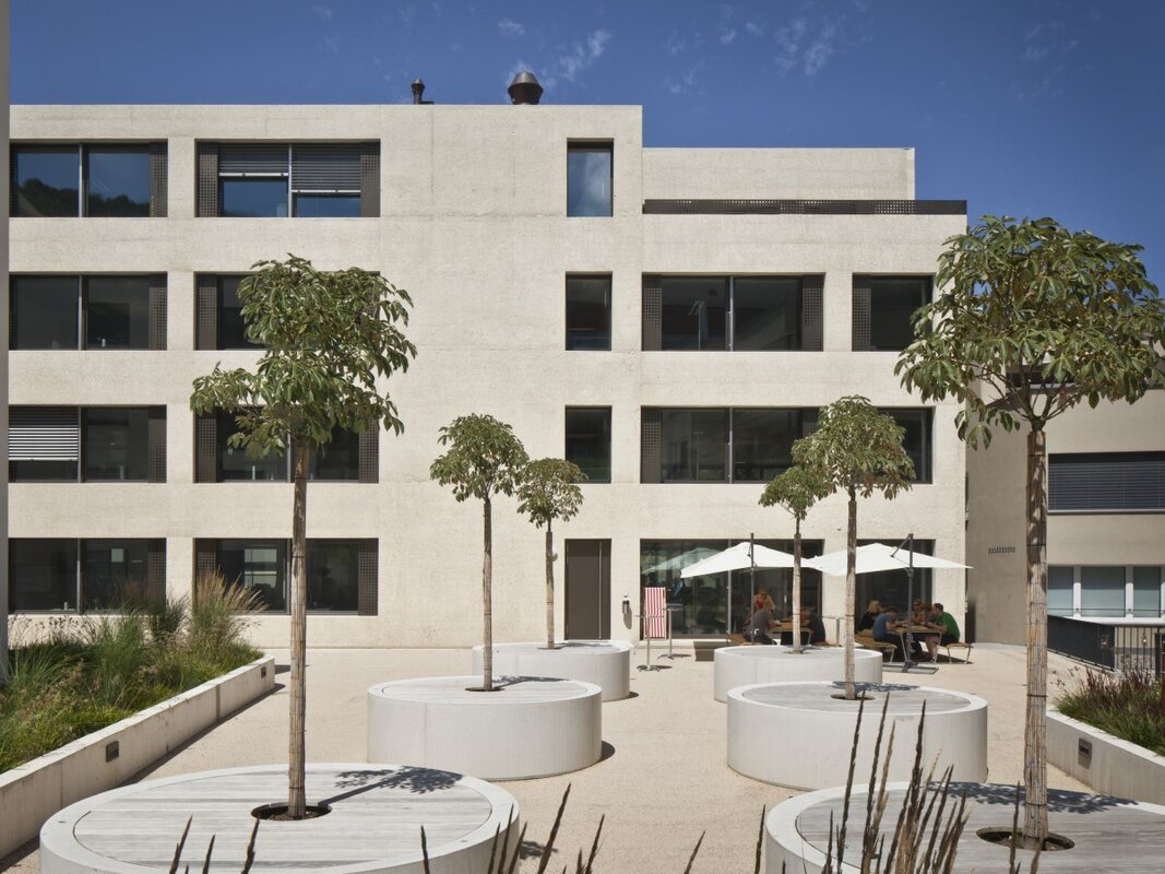 Die Gebäude wurden einerseits in Kalksteinbeton (Bürobau) und andererseits als Kompaktfassade (Wohnbau) im gleichen Farbton erbaut.