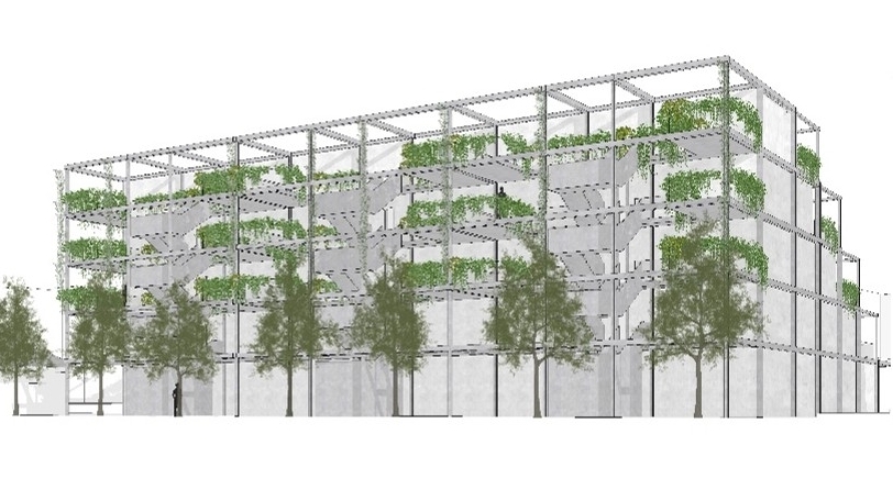 Das Gebäude wird als kompakter, terrassierter Baukörper realisiert, der auf die heterogene Umgebung reagiert und individuelle Aussenräume für Bewohner und Nutzer schafft. Die Erschliessung erfolgt über die Halbartenstrasse durch eine begrünte Zugangsschicht mit filternder Funktion. Rankgerüste bieten Schatten und gestalten die Sitz- und Eingangsbereiche.