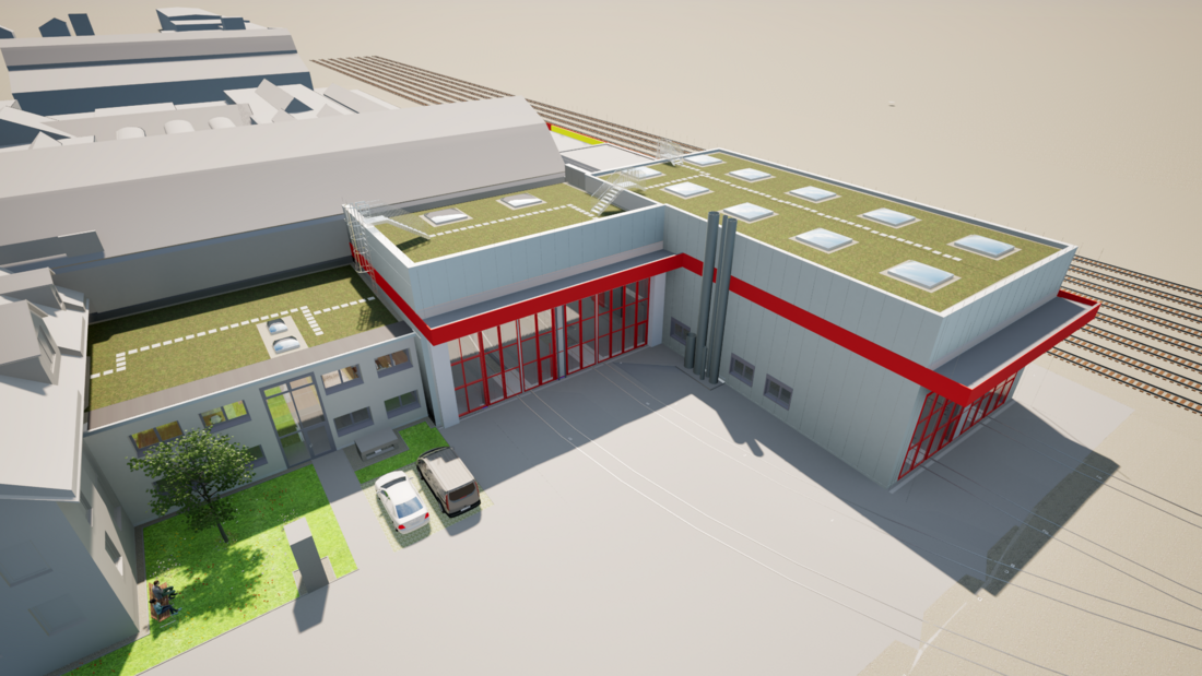 Die Hallenerweiterung wurde in Rücksprache mit der Denkmalpflege sowie die Grubengleise auf die Bedürfnisse des Bestellers dimensioniert. Die neue nördliche Erweiterung der Werkstatt gliedert sich in 2 Trakte (Halle Ost und Halle West) mit sich unterscheidenden Abmessungen, Geschossigkeit und Materialisierung.